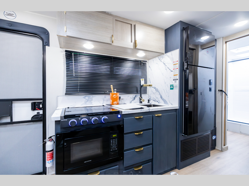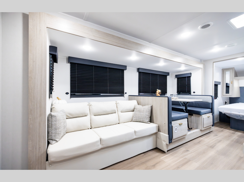 The 81" interior ceiling height throughout provides ample space to move around, while our residential-inspired kitchen and living spaces make you feel right at home. Our tankless on-demand water heater provides endless hot water, while the power awning with adjustable legs offers the perfect outdoor retreat. Plus, with a 7-way plug and chain holder, you'll be ready to hook up and go.